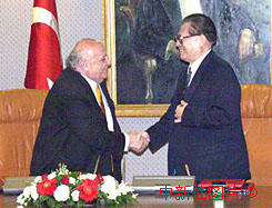 江澤民與土耳其總統(tǒng)德米雷爾共同簽署聯(lián)合公報(bào) 2000年4月20日 10:35 ![]() 中國(guó)國(guó)家主席江澤民與土耳其總統(tǒng)德米雷爾4月19日在安卡拉會(huì)談后簽署了聯(lián)合公報(bào)。中新社記者 彭偉祥 攝 相關(guān)專題:江澤民訪六國(guó) |