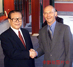 中歐十九日達(dá)成中國入世協(xié)議后,江澤民主席在會見歐盟貿(mào)易委員拉米一行。 2000年5月19日 21:21 ![]() 中國與歐盟十九日達(dá)成了中歐之間關(guān)于中國加入世貿(mào)組織的雙邊協(xié)議后,國家主席江澤民在北京中南海會見歐盟貿(mào)易委員拉米一行。 |