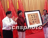 圖:李勁祥向宋氏祖居基金會(huì)贈(zèng)送蔣緯國(guó)先生手書復(fù)制件 2001年10月18日 22:15 ![]() 歐美同學(xué)會(huì)副會(huì)長(zhǎng)、全球華人反獨(dú)促統(tǒng)聯(lián)盟副會(huì)長(zhǎng)李勁祥先生(左一)18日在贈(zèng)送把一九九三年蔣緯國(guó)先生親贈(zèng)與他的“和平統(tǒng)一、振興中華”的手書復(fù)制件贈(zèng)送海南向宋氏祖居基金會(huì)。中新社圖 王辛莉 攝 |