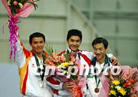 奧運(yùn)明星邢傲偉十八日在九運(yùn)會(huì)男子自由體操比賽中獲得冠軍,盧裕富、楊威分別獲得第二、三名。中新社記者 張宇 攝