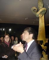 ![]() 紐約大都會(huì)博物館亞洲部副主任孫志新博士,向人們解說(shuō)首次在美國(guó)亮相的中國(guó)四川三星堆青銅器的特點(diǎn)。他身后的青銅人像全高兩米六,是世界上現(xiàn)存最高的青銅像。銅像兩手一高一低,好像握著什么東西。