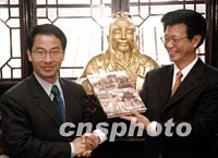 圖文:臺(tái)北孔廟訪問團(tuán)一行三十六人來滬交流 2002年03月20日 06:03 ![]() 前來參加此間滬臺(tái)兩地“佾舞文化交流”活動(dòng)的臺(tái)北市“民政局長(zhǎng)”林正修,今日上午參觀了上海文廟。圖為林正修(圖左)在參觀中。中新社圖 湯彥俊 攝