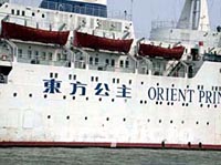 四月八日下午,廣州海事法院根據(jù)“東方公主”輪五十一名船員的海事請求保全申請,發(fā)出扣押令,在廣州港泥洲頭水域扣押了該輪,以解決船員工資被拖欠問題。中新社圖 胡后波 攝