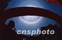 圖:福州突現(xiàn)日暈外“暈”奇觀 2002年04月14日 19:08 ![]() 十三日上午福州上空出現(xiàn)一道瑰麗的奇觀:在燦爛的太陽周圍有一個耀眼的光環(huán)。半小時過后,出現(xiàn)一個相對顏色淺一些的光環(huán)(如圖)。十幾分鐘后,光環(huán)漸漸淡去,這種美麗奇觀前后持續(xù)了約一個多小時,讓觀者嘖嘖稱奇。據(jù)省氣象臺說;這種現(xiàn)象在氣象學(xué)中稱“日暈”,對天氣沒有什么影響。中新社圖 楊婀娜 攝
