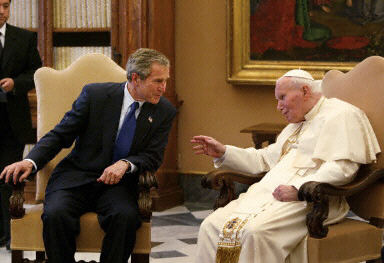 圖:布什會見羅馬教皇 討論天主教性丑聞事件 2002年05月29日 11:21 美國總統(tǒng)布什在梵蒂岡與羅馬教皇約翰·保羅二世舉行短暫會晤。會晤中談及有關中東危機和美國羅馬天主教性丑聞等問題。法新供中新