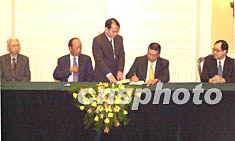 圖:澳門政府與銀河公司簽署博彩經(jīng)營批給合同 2002年06月27日 11:13 ![]() 澳門特區(qū)行政長官何厚鏵二十六日在澳門政府總部輿銀河娛樂場股份有限公司董事呂志和(左二)、范少朋(左一)簽署娛樂場幸運(yùn)博彩經(jīng)營批給合同。中新社記者 李剛 攝