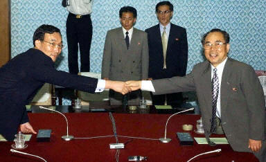 圖:韓國與朝鮮3日在金剛山舉行會談 2002年08月03日 19:44 ![]() 韓國與朝鮮3日下午在朝鮮金剛山旅館舉行了第七次部長級會談預(yù)備性接觸的首次全體會議,雙方著重討論了部長級會談在漢城舉行的時間和議題等問題。圖為在金剛山韓國與朝鮮的代表握手。