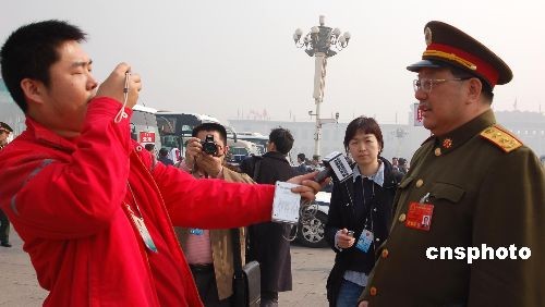 3月10日,十一屆全國(guó)人大一次會(huì)議在北京人民大會(huì)堂舉行第三次全體會(huì)議。一名記者在會(huì)場(chǎng)外的天安門(mén)廣場(chǎng)抓住一名解放軍中將采訪,因?yàn)闄C(jī)會(huì)難得,一手拿話筒、一手握相機(jī)著實(shí)忙活。中新社發(fā) 劉萬(wàn)強(qiáng) 攝