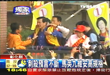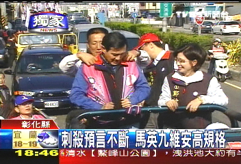 這一陣子馬英九所到之處,總是防彈公文包、防彈盾牌貼身護(hù)衛(wèi)。尤其是在上個(gè)星期六,馬陣營接獲通知有人要在嘉義刺殺馬英九,安全人員立刻進(jìn)入紅色警戒。