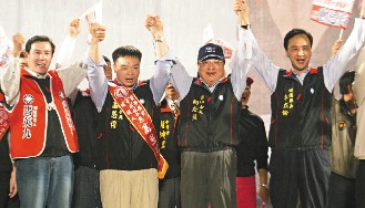 國民黨2008參選人馬英九(左一)與臺中市長胡志強(qiáng)(右二)、桃園縣長朱立倫(右)昨晚到臺南,幫“立委”候選人高思博(左二)站臺。(圖:臺灣《聯(lián)合報》)