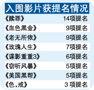 被喻為“英國奧斯卡”的2008年英國影視藝術(shù)文化學(xué)院頒獎(jiǎng)禮(BAFTA),前日公布提名名單,《色,戒》報(bào)名角逐最佳電影、導(dǎo)演及女主角等11個(gè)項(xiàng)目,結(jié)果除了較早前公布入圍最佳新人(湯唯)和外語片之外,只有最佳服裝設(shè)計(jì)(樸若木)能獲提名;而凱拉·奈特利主演的《贖罪》,則獲得本屆最多14項(xiàng)提名,成為大熱之選。