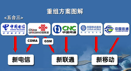 5月23日上午,盛傳已久的中國電信業(yè)第三次重組終于拉開帷幕。重組方案除衛(wèi)通的基礎電信業(yè)務并入中國電信外,與此前流傳的“五合三”方案大致相同(如右圖所示)。三大運營商人事安排:王建宙出任中國移動董事長兼總裁,張春江任第一副總裁兼黨組書記;王曉初出任中國電信董事長兼總裁,尚冰任黨組書記;常小兵任新聯(lián)通籌備組組長。