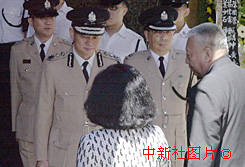 香港行政長官董建華20日在殯儀館參加因公殉職的香港高級入境事務(wù)主任梁錦光喪禮。中新社傳真洪少葵攝