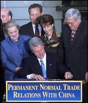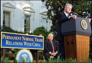 圖文:克林頓簽署PNTR法案 2000年10月11日 11:35 克林頓在多名曾為PNTR法案不斷努力的官員陪同下,正式簽署PNTR法案,為中美關系邁入一個歷史性的新里程。 克林頓在總統(tǒng)任期內(nèi)完成心愿,簽署PNTR法案,他形容這是他在任期內(nèi)的一大勝利。(圖據(jù)外電) 中新社華盛頓十月十日電(記者徐德金)美國總統(tǒng)克林頓今天下午在白宮南草坪舉行儀式,簽署了對華永久性正常貿(mào)易關系(PNTR)法案。由此,這項已在國會眾議院、參議院通過的法案成為法律,正式生效。 白宮說,克林頓簽署PNTR法案是美中關系的歷史性時刻,中國將向美國的商品與服務業(yè)打開市場,加強美中關系。 中、美兩國政府于去年十一月十五日在北京簽署關于中國加入世界貿(mào)易組織的雙邊協(xié)議,這份被稱作“雙贏”的協(xié)議,促進了中美兩國經(jīng)貿(mào)關系,也加快了中國邁向WTO的進程。 今年三月,克林頓向國會提交了一項關于給予中國永久性正常貿(mào)易關系地位的立法建議。此后數(shù)月,克林頓及美國聯(lián)邦政府高級官員不斷呼吁、敦促國會,盡早審議、通過PNTR案。今年五月二十四日,眾議院以二百三十七票對一百九十七票批準了PNTR案;九月十九日,參議院又以八十三票對十五票的壓倒性多數(shù)通過了該案。 該法案生效后,將結(jié)束二十年來美國國會每年審議一次對華“正常貿(mào)易關系”(一九九八年前叫“最惠國待遇”)的歷史,與中國建立永久正常貿(mào)易關系。實現(xiàn)美對華永久正常貿(mào)易關系符合世貿(mào)組織的規(guī)定,符合中美兩國人民的根本利益,有利于推動中美經(jīng)貿(mào)合作和中美關系繼續(xù)向前發(fā)展。 不過,人們注意到克林頓今天簽署的法案,包含了干涉中國內(nèi)政、損害中國利益的內(nèi)容。中方已向美方表明了堅決反對的嚴正立場。 美國方面稱,過去二十年,美中貿(mào)易已從無關緊要的水平提高到每年增長一百四十億美元的水平。今后,美國產(chǎn)品將更容易進入一個超過十二億人口的市場。 (完) |