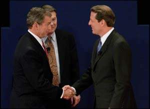 圖文:美國(guó)總統(tǒng)候選人展開(kāi)第二場(chǎng)辯論 2000年10月12日 16:16 ![]() 距離11月7號(hào)的大選不足4周,戈?duì)?右)與小布什(左)再度在電視辯論上交鋒。兩人在開(kāi)始交戰(zhàn)時(shí),先握手示好。 中新網(wǎng)北京10月12日消息:美國(guó)民主黨總統(tǒng)候選人、現(xiàn)任副總統(tǒng)戈?duì),與共和黨總統(tǒng)候選人、得州州長(zhǎng)布什,已經(jīng)在美東時(shí)間周三晚9時(shí)展開(kāi)他們的第二場(chǎng)辯論。 這次辯論在北卡羅萊納州的WakeForest大學(xué)舉行,并仍然由公共電視臺(tái)(PBS)的萊勒主持。 這次辯論的方式將不同于第一次。兩位總統(tǒng)候選人采取隨意的談話方式,坐下來(lái)回答主持人的提問(wèn)。這正是布什所擅長(zhǎng)的方式。每人有2分鐘的時(shí)間回答提問(wèn),在辯論結(jié)束時(shí),有2分鐘的時(shí)間作結(jié)束演講。 估計(jì)兩人會(huì)繼續(xù)就政府角色和架構(gòu)針?shù)h相對(duì),但中東和平和南斯拉夫局勢(shì)等外交問(wèn)題也會(huì)是辯論的議題之一。 戈?duì)柌际驳牡谝粓?chǎng)辯論已于本月3日晚進(jìn)行,原來(lái)預(yù)期多達(dá)7,500萬(wàn)民眾收看首場(chǎng)辯論。但實(shí)際上只有4,600萬(wàn)人收看了第一場(chǎng)辯論。 首場(chǎng)辯論會(huì)結(jié)束后,美國(guó)各大媒體做的民調(diào)顯示,民眾認(rèn)為戈?duì)柕谋憩F(xiàn)略勝布什一籌,但戈?duì)栁茨軘U(kuò)大領(lǐng)先布什的優(yōu)勢(shì)。首場(chǎng)辯論對(duì)選民并未產(chǎn)生預(yù)期的影響,民調(diào)表明,在首場(chǎng)辯論后,仍然有超過(guò)22%的選民心意未決。(圖文據(jù)外電) |