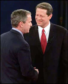 圖文:戈爾及布什第三輪電視辯論開始 2000年10月18日 10:02 ![]() 戈爾與小布什禮節(jié)性握手 中新網(wǎng)華盛頓10月18日消息:距離美國總統(tǒng)大選頭偏只剩下3星期。民主和共和兩黨候選人戈爾及喬治布什,于北京時間今早9時展開第三輪電視辯論。這也是選舉前最后一次辯論,盡力爭取仍未作出決定的選民支持。 電視辯論在華盛頓大學舉行,歷時90分鐘。在開始辯論前,主持人宣布為剛在空難中喪生的密蘇里州州長卡納翰默哀。兩人將會在今天辯論中,集中討論外交問題。(圖文均據(jù)外電) 相關(guān)報道:戈爾和小布什今天進行最后一場電視辯論 相關(guān)報道:調(diào)查顯示小布什第二輪電視辯論表現(xiàn)佳 相關(guān)報道:民調(diào)顯示戈爾、布什首次電視辯論未見明顯輸贏 |