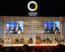 第三屆亞歐首腦會(huì)議開幕式大屏幕上顯示朱镕基總理的形象。中新社記者:王曉暉 攝