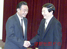 中國國務(wù)院總理朱镕基訪問日本、韓國后,22日乘專機回到北京,國務(wù)院副總理吳邦國等在北京人民大會堂迎接。中新社記者 毛建軍 攝