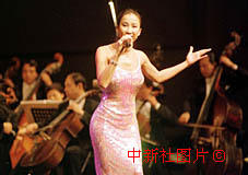 ‘臺(tái)灣歌星李玟二十一日晚在澳門國(guó)際音樂(lè)節(jié)閉幕式上連唱數(shù)曲,這是她首次在龐大的古典樂(lè)隊(duì)伴奏下演唱,臺(tái)風(fēng)時(shí)而莊重,時(shí)而活潑。中新社傳真 宗金柱 攝