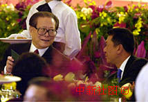 國家主席江澤民在慶祝澳門回歸一周年晚宴上同行政長官何厚鏵親切交談。中新社傳真 宗金柱 攝