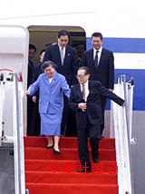 國家主席江澤民和夫人王冶坪19日下午乘專機抵達澳門機場,出席澳門回歸祖國一周年慶典活動。中新社傳真 滿會喬攝