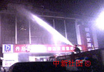 消防人員趕到河南洛陽(yáng)發(fā)生重大火災(zāi)的商廈前,奮力噴水救人。中新社圖