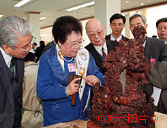 陳麗華向全國(guó)政協(xié)委員介紹紫檀雕刻工藝 2000年3月12日 09:32 ![]()