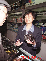 全國(guó)人大代表、鳳凰光學(xué)股份有限公司副總經(jīng)理嚴(yán)志峻(右)十三日利用會(huì)議間隙到北京鳳凰相機(jī)專柜站柜臺(tái),向顧客介紹鳳凰新產(chǎn)品。作者:王麗南