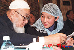 來自甘肅的保安族少女馬香梅(右)是出席九屆全國人大三次會議的代表中年齡最小的一位。圖為她與人大代表、甘肅省伊斯蘭教協會會長楊森十四日在小組會上討論。作者:王麗南