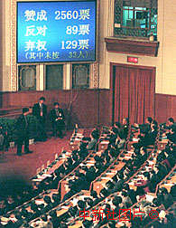 九屆全國(guó)人大三次會(huì)議十五日舉行閉幕會(huì),以二千五百六十票贊成、八十九票反對(duì)、一百二十九票棄權(quán)通過(guò)了中華人民共和國(guó)立法法草案。該法案從今年七月一日起施行。作者:王麗南