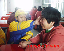 元宵節(jié)來北京勞教所看望母親的孩子,給曾是法輪功練習(xí)者的媽媽擦拭淚水。中新社圖 王巖 攝