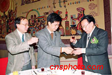 新世紀新聞年會18日在北京人民大會堂舉行,近百家新聞單位的負責人出席年會。圖為中新社總編輯郭招金(中)與新聞界的同行互致問候。中新社圖 鄭瑞德 攝