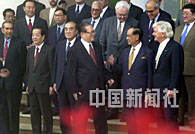 中國國家主席江澤民二十六日在海南博鰲水城集體會(huì)見出席亞洲論壇的貴賓,與亞洲論壇前政要們在一起。中新社記者 賈國榮 攝