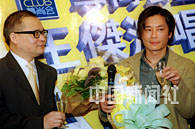 歌星王杰27日在香港出席「尊尚會(huì)呈獻(xiàn)王杰演唱會(huì)WANG'S 2001」記者會(huì),會(huì)上英皇娛樂行政總裁李進(jìn)與歌星王杰祝酒。中新社傳真 鄧慶樂 攝
