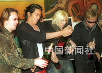 日本紅星反町隆史(圖左二)6日抵港,并立即與香港記者會(huì)面。為預(yù)祝他個(gè)唱演出成功先開(kāi)香檳,反町隆史將于7日在香港舉行首次個(gè)人演唱會(huì)。中新社傳真鄧慶樂(lè)攝
