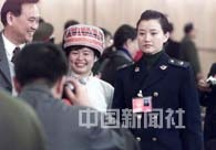 九屆全國人大四次會(huì)議第五次全體會(huì)議十五日上午在北京人民大會(huì)堂舉行,出席會(huì)議的少數(shù)民族代表與著名歌唱演員宋祖英合影。中新社記者 毛建軍 攝