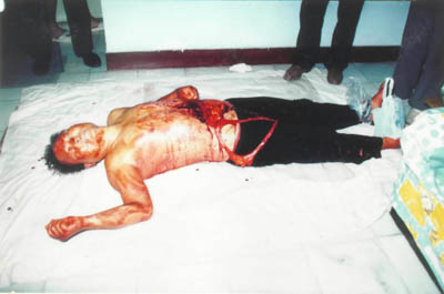 圖:馬健民剖腹尋“法輪” 2001年3月23日 16:55 ![]() 馬健民,男,54歲,華北油田退休職工。其家人稱,馬已練習“法輪功”兩年左右,達到了癡迷的程度,時常出現(xiàn)精神恍惚和失常,堅持認為自己的腹部有個“法輪”。1998年9月4日馬健民在家中用剪刀剖腹尋找,因救治不及時死亡。這是馬健民自殺后的慘景。新華社發(fā) |
