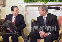 美國總統(tǒng)布什二十二日在白宮會見中國國務(wù)院副總理錢其琛時(shí)說,他期待著今年秋天到中國訪問。中新社圖 京華 攝
