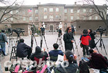 中美撞機(jī)事件引起中外新聞媒體的極大關(guān)注。四月六日,記者們?cè)诒本┟绹v華大使館門前支起攝像機(jī),安營扎寨。中新社記者 史利 攝