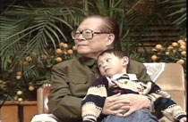 中國國家主席、中央軍委主席江澤民二十日在北京人民大會堂抱著王偉的兒子,會見被美機(jī)撞毀犧牲的飛行員王偉的家屬。