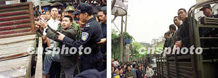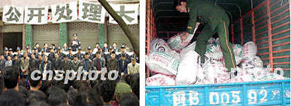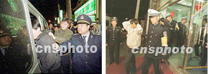 新聞組圖:中國各地嚴(yán)打行動 2001年4月25日 10:04 ![]() 圖(1) 圖(2) ![]() 圖(3) 圖(4) ![]() 圖(5) 圖(6) 圖(1)說明:北京西城公安分局、工商局日前聯(lián)合在夜間清理音像市場,當(dāng)場抓獲販賣盜版光盤人員十余名。中新社記者宋吉河攝 圖(2)說明:北京公安西城公安分局日前夜間收容外地進京“三無”人員,全面整頓社會治安。中新社記者宋吉河攝 圖(3)說明:重慶市巴南區(qū)二十四日在電影院廣場前公開審判十九名刑事犯罪分子,上千名當(dāng)?shù)厝罕妳⒓恿舜髸,無不拍手稱快。中新社記者趙振清攝 圖(4)說明:福清市公安邊防大隊官兵,23日凌晨在“治爆緝槍專項行動”中,先后破獲二起特大偷運、私藏炸藥案,共查獲土制銨油炸藥5000多公斤、雷管283枚、導(dǎo)火索250米。圖為一名邊防警員在福清海口鎮(zhèn)方新村官下尾路段攔檢一輛裝載有土制銨油炸藥的可疑貨車。中新社圖賀錕陳暉攝 圖(5)說明:中國重慶市巴南區(qū)二十四日在該區(qū)電影院廣場前公開審判十九名刑事犯罪分子,當(dāng)?shù)厣锨忻駠^犯罪分子被押上刑車,送往監(jiān)獄的過程。中新社記者趙振清攝 圖(6)說明:中國重慶市巴南區(qū)二十四日在該區(qū)影院廣場公開審判十九名刑事犯罪分子,當(dāng)?shù)厍忻瘳F(xiàn)場目睹犯罪分子被押上刑車,送往監(jiān)獄的過程。中新社記者趙振清攝 |