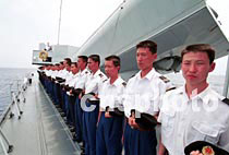 ![]() 509號(hào)導(dǎo)彈護(hù)衛(wèi)艦官兵脫帽肅立,為英雄王偉送行。 張全躍 攝 ![]() 王偉妻子阮國(guó)琴(中)、姐姐王琳(左三)在海軍509號(hào)導(dǎo)彈護(hù)衛(wèi)艦甲板上為王偉默哀。中新社圖 張全躍 攝