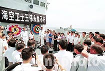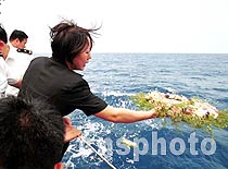 ![]() 阮國(guó)琴把花環(huán)拋進(jìn)大海,祭奠自己的丈夫。中新社圖 張全躍 攝 ![]() 解放軍海軍領(lǐng)導(dǎo),海南省政府、浙江湖州市政府官員和王偉的妻子阮國(guó)琴、姐姐王琳等乘海軍某部509艦參加了海上祭奠活動(dòng)。中新社圖 張全躍 攝
