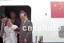 ![]() 中國國家主席江澤民5月8日中午乘專機抵達(dá)香港機場,參加“2001年《財富》全球論壇”,登車前向采訪的記者招手致意。中新社傳真任晨鳴攝