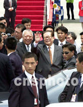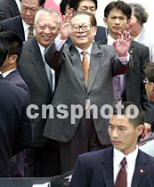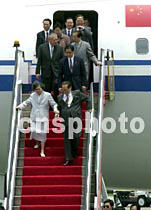 ![]() 中國國家主席江澤民5月8日中午乘專機(jī)抵達(dá)香港機(jī)場,參加“2001年《財富》全球論壇”,登車前向采訪的記者招手致意。中新社傳真任晨鳴攝