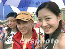 中國香港車手周浩云(中)與內(nèi)地名模金姝懿(右)、王茵(左)在捷克布諾賽車場,為中國宗申摩托車隊取得歷史性好成績喜笑顏開。中新社圖 方迎忠 攝