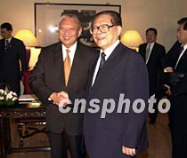 圖文:江澤民出席董建華午宴 2001年5月9日 16:04 ![]() 江澤民五月九日出席香港特區(qū)行政長(zhǎng)官董建華舉辦的午宴上與董先生親切握手。中新社圖 任海霞 攝