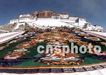 圖:巨型唐卡《至貴殊靈彩緞?wù)狗稹穼⒃诒本┱钩?br> 2001年5月9日 19:49 ![]() 由西藏著名藝術(shù)家用一年多時間制成的巨型唐卡《至貴殊靈彩緞?wù)狗稹穼⒃诒本┱褂[的西藏文化展上展出。該唐卡高45米、寬35米,為世界之最,已被列入吉尼斯世界記錄。中新社圖 吳新華 攝