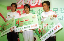 影星周星馳、本地甲組足球員丘健威(右)、陳豪文(左)8日在香港出席“2001麥當(dāng)勞青少年足球推廣”記者會,獲邀出任足球大使,協(xié)助青少年足球推廣活動。中新社傳真 鄧慶樂 攝