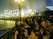五月八日晚在香港舉行的祝賀“2001年《財富》論壇”煙花匯演上,無數(shù)市民爭相涌上街頭一睹絢麗多彩的煙花。中新社圖 洪少葵 攝